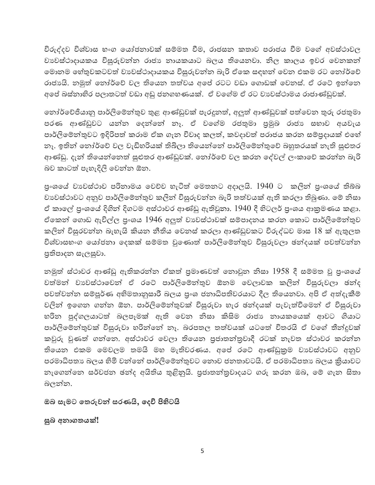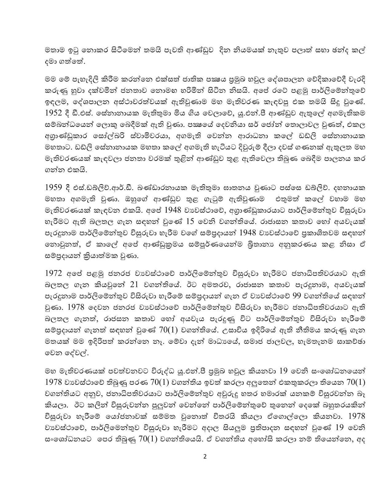 ” ලංකාවේ ඉන්නේ සෘජුවම ජනතාව විසින් ජන්දයෙන් පත් කරන ලද විධායක ජනාධිපතිවරයෙක්. ඔහුට ජනතාව දී ඇති බලය පාර්ලිමෙන්තුවේ තුනෙන් දෙකේ බහුතරයක් සහ ජනමත විචාරණයකින් මිස කිසිවෙකුටත් අවලංගු කළ නොහැකි බව 19 වන සංශෝධනය ගැන ශ්රේෂ්ඨාධිකරණය දුන් තින්දුවේ සදහන් වෙනවා. 19 වෙනි සංශෝධනයට පෙර ව්යවස්ථාවේ තිබුණු 70 (1) වගන්තිය ඉවත් කරයි කියලා ප්රකාශ කලාට ඇත්තටම සිදුවුනේ 70(1) යටතේ පාර්ලිමෙන්තුව විසුරුවන්න ජනාධිපතිවරයාට හිමි බලතල ව්යවස්ථාවේ වෙන තැනකට ගෙන යෑමයි.
