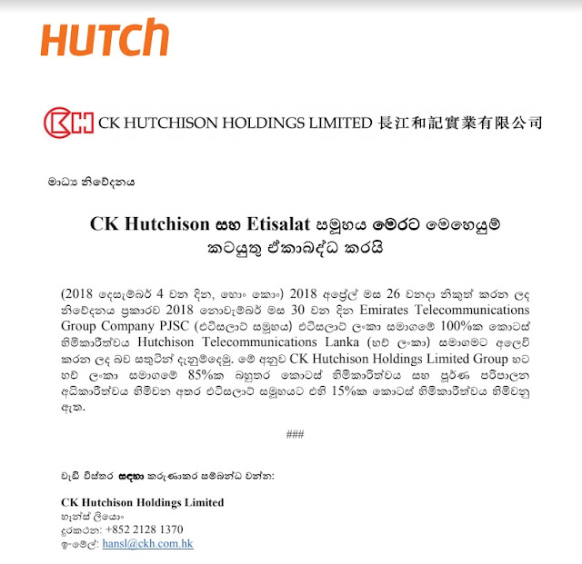 2018 නොවැම්බර් මස 30 වැනිදා දින සිට මෙම හිමිකාරීත්වය ලැබුණු බව හච්සන් හෝල්ඩිංස් ලිමිටඩ් සමූහය නිවේදනයක් නිකුත් කරමින් පෙන්වා දෙයි.