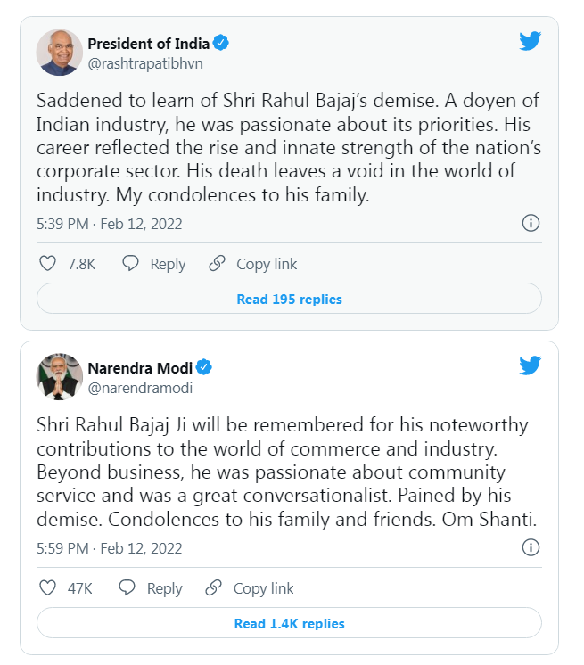 රාහුල් බජාජ් මහතාගේ අභාවය පිළිබඳ ඉන්දියාවේ ජනාධිපතිවරයා සහ අගමැතිවරයා ඇතුළු විශාල පිරිසක් ශෝක පණිවිඩ නිකුත් කර තිබුණා.