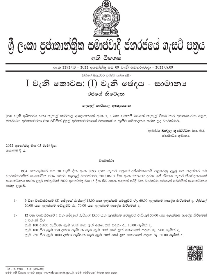 එමෙන්ම ලියාපදිංචි තැපැල් ගාස්තුව රුපියල් 30 සිට රුපියල් 60ක් දක්වා ඉහළ දමනු ලබයි.