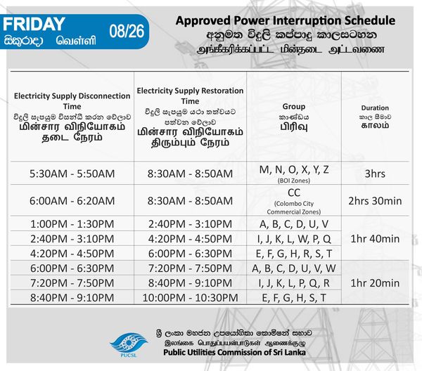 අද (26) විදුලි කප්පාදුව සිදුවන ආකාරය මහජන උපයෝගීතා කොමිසම විසින් නිවේදනය කර තිබෙනවා.