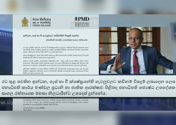 රට තුළ පවතින ඉන්ධන, ගෑස් හා වී ක්ෂේත්රයන්හි ගැටළුවලට කඩිනම් විසඳුම් ලබාදෙන ලෙස ජනාධිපති කාර්ය මණ්ඩල ප්රධානී හා ජාතික ආරක්ෂාව පිළිබඳ ජනාධිපති ජේෂ්ඨ උපදේශක සාගල රත්නායක නිලධාරීන්ට උපදෙස් ලබා දී තිබෙනවා. ඒ ජනාධිපති ලේකම් කාර්යාලයේ පැවති සාකච්ඡාවකදී.