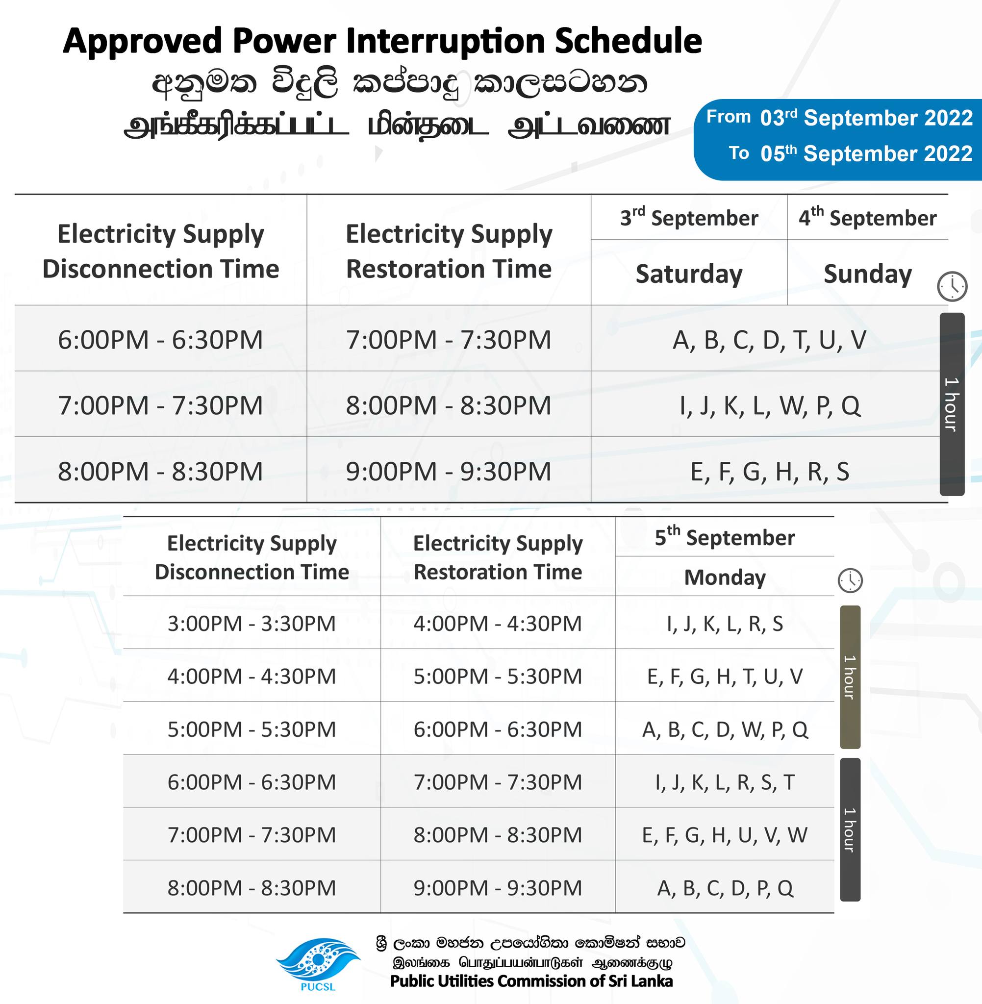 කලාප අනුව විදුලිය කප්පාදු කිරීමට නියමිත පැය ගණන් මෙසේයි.