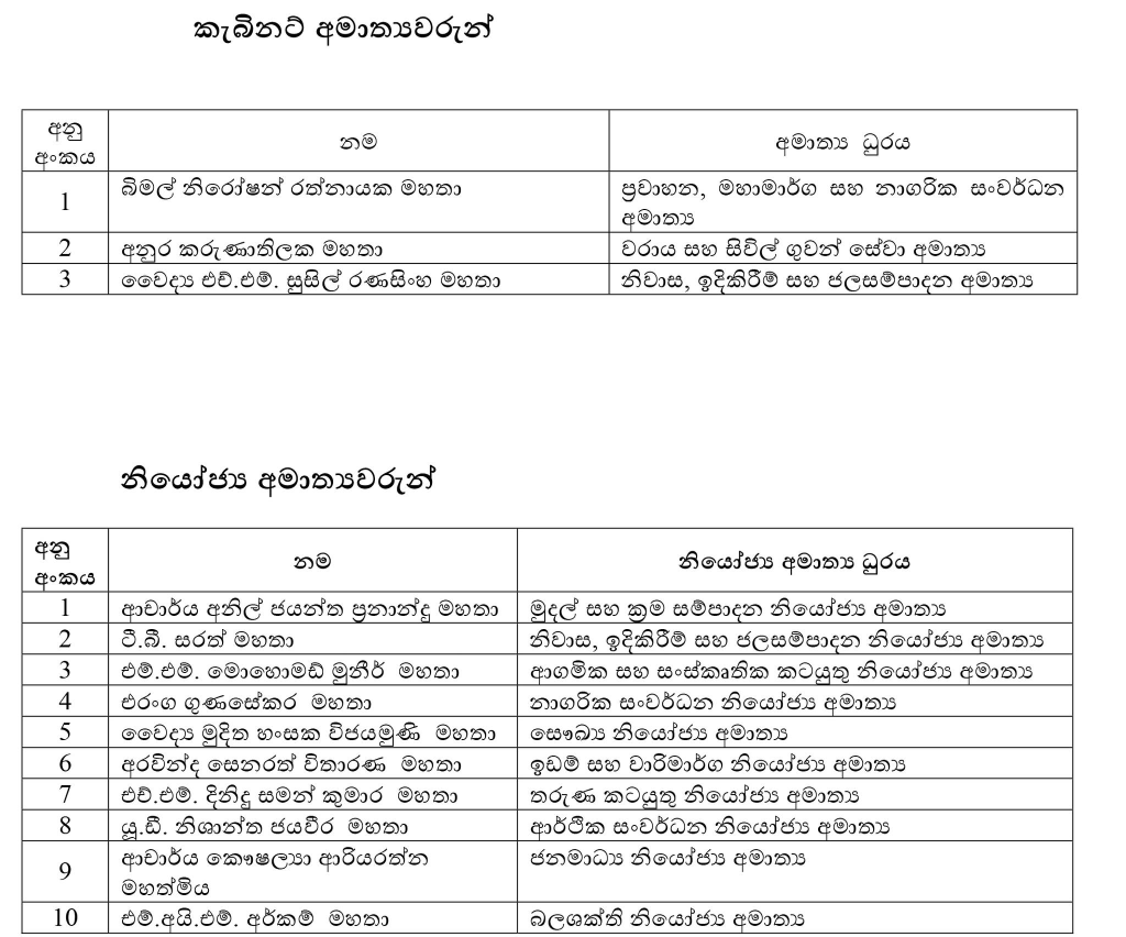2026 වසරට අදාළ අයවැය ක්‍රියාත්මක කිරීමත් සමඟ රජයේ සංවර්ධන ඉලක්ක වඩාත් වේගයෙන් හා කාර්යක්ෂමව ළඟා කර ගැනීම සඳහා රජය අමාත්‍ය මණ්ඩලය සංශෝධනය කිරීමට පියවර ගෙන තිබෙනවා. ඒ අනුව, අද (10) උදෑසන ජනාධිපති කාර්යාලයේදී ජනාධිපතිවරයා හමුවේ නව අමාත්‍යවරුන් සහ නියෝජ්‍ය අමාත්‍යවරුන් දිවුරුම් දීමට නියමිතයි.