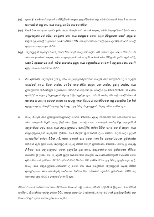 ඒ අනුව, සහන ලබා ගැනීම සඳහා ණය ගනුදෙනුකරුවන් විසින් 2026 ජනවාරි 15 වැනි දිනට පෙර අදාළ බලපත්‍රලාභී බැංකු වෙත ලිඛිතව හෝ විද්‍යුත් මාර්ගයෙන් ඉල්ලීමක් කළවිට, පහත දක්වා ඇති සහන ලබා දීමට බලපත්‍රලාභී බැංකු කටයුතු කළ යුතු බවත් දැනුම් දී තිබෙන බවට වාර්තා වනවා.