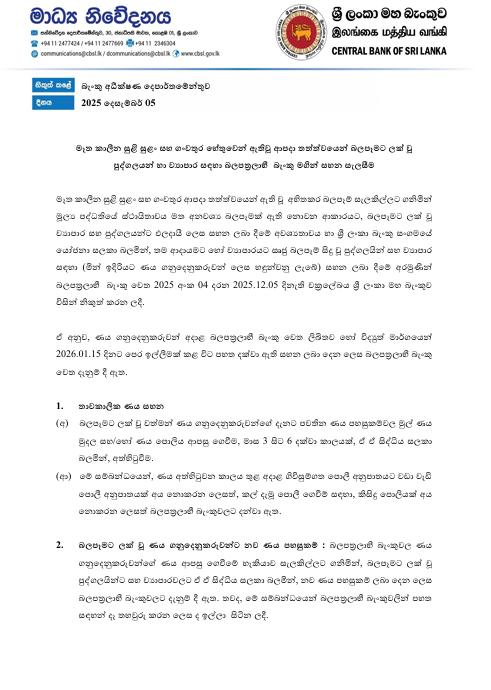 මෑත කාලීන සුළි සුළං සහ ගංවතුර ආපදා තත්ත්වය හේතුවෙන් ඇති වූ අහිතකර බලපෑම් සැලකිල්ලට ගනිමින්, මූල්‍ය පද්ධතියේ ස්ථායිතාවයට හානියක් නොවන අයුරින්, පීඩාවට පත් වූ පුද්ගලයින්ට සහ ව්‍යාපාරවලට (මින් ඉදිරියට ‘ණය ගනුදෙනුකරුවන්’ ලෙස හැඳින්වේ) ඵලදායී ලෙස සහන ලබාදීමේ අවශ්‍යතාවය ශ්‍රී ලංකා මහ බැංකුව විසින් හඳුනා ගෙන තිබෙනවා. ශ්‍රී ලංකා බැංකු සංගමයේ යෝජනා ද සලකා බලමින්, තම ආදායමට හෝ ව්‍යාපාර කටයුතුවලට සෘජුවම බලපෑම් සිදු වූ ණය ගනුදෙනුකරුවන්ට සහන සැපයීම සඳහා 2025.12.05 දිනැති අංක 04 දරන 2025 චක්‍රලේඛය බලපත්‍රලාභී බැංකු වෙත නිකුත් කර ඇතැයි වාර්තාවනවා.