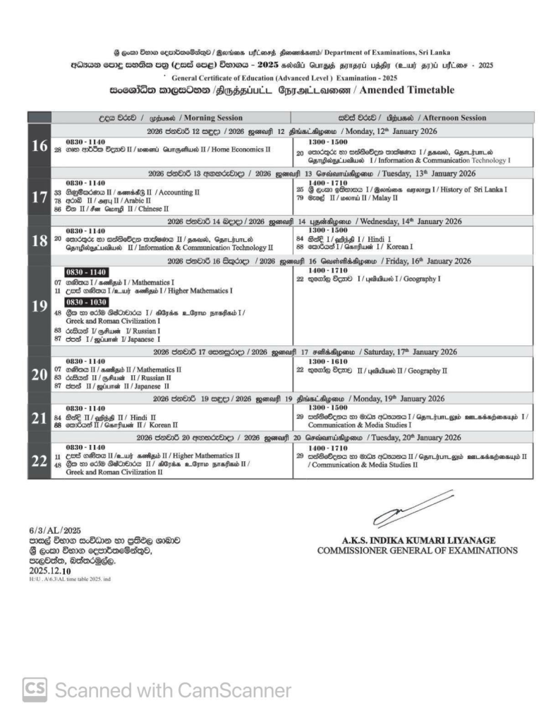 ඒ අනුව, අයහපත් කාලගුණය හේතුවෙන් නොපැවැත්වුණු විෂයන් 2026 ජනවාරි මස 12 වැනිදා සිට 20 වැනිදා දක්වා කාලය තුළ නැවත කාලසටහන්ගත කිරීමට නියමිත බවයි වැඩිදුරටත් වාර්තා වන්නේ.